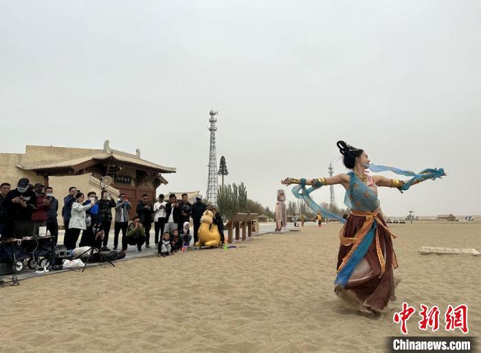 近年來,敦煌市委網信辦以“壁畫變裝秀”“飛天舞蹈短視頻”“漫說敦煌歷史”等形式,弘揚敦煌文化。6月以來,內地很多敦煌舞愛好者涌向敦煌,穿上以飛天服飾為代表的各種古裝,在絲綢之路旅游網紅“打卡地”鳴沙山月牙泉、玉門關、陽關等景區拍照、直播,各種不同的古裝服飾也為“大漠孤煙直”的絲路古道增添了無限色彩。