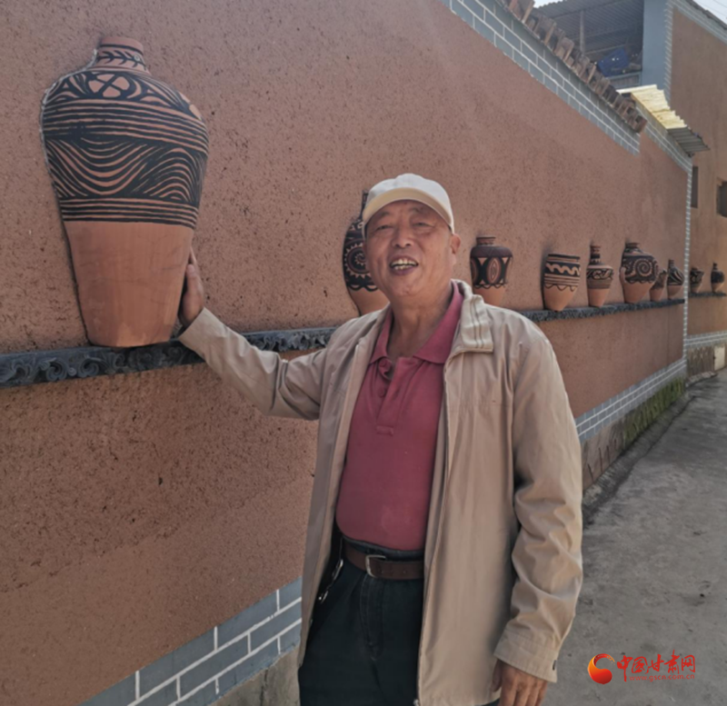 探訪完寺洼遺址后,記者一行又來到馬家窯村實地采訪。走進馬家窯村,街道干凈整潔,花壇綠蔭中紅花奪目。尤其花壇內間隔樹立的馬家窯陶器,和村內道路兩旁墻上鑲嵌的造型各異的陶器,更讓整個村子彌漫出濃厚的歷史氛圍。