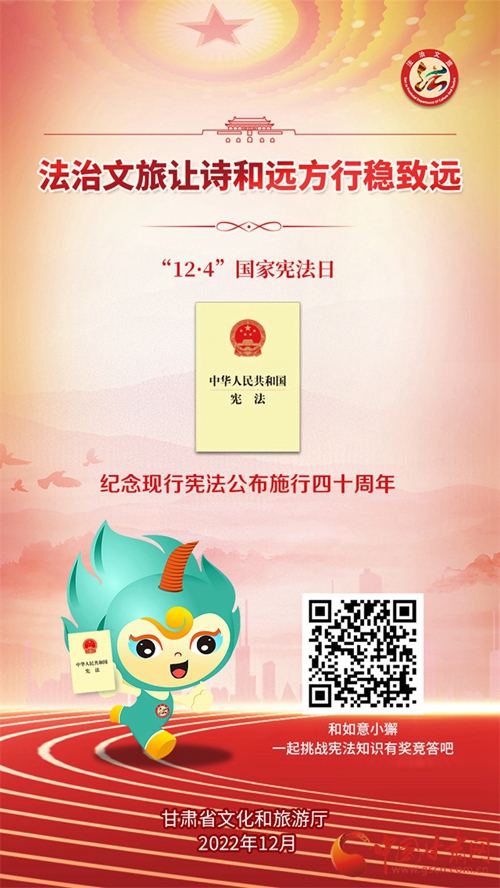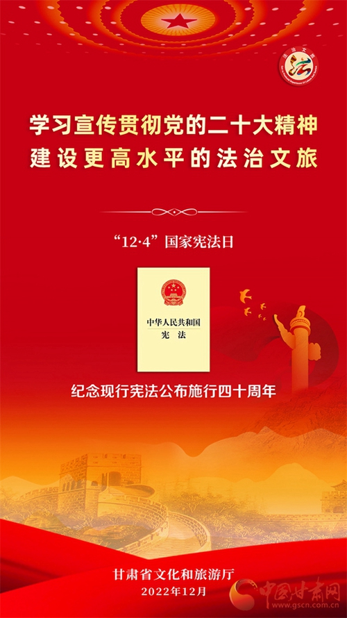 中國甘肅網12月7日訊 (本網記者 張蘭琴)自12月4日國家憲法日暨憲法宣傳周啟動以來,我省各地開展了形式多樣的宣傳活動,為深入學習宣傳貫徹黨的二十大精神,不斷增強人民群眾法治意識,形成全民維護憲法的濃厚氛圍,同時加強文化和旅游的法治宣傳教育,省文旅廳近日開展了國家憲法日暨憲法宣傳周系列活動。