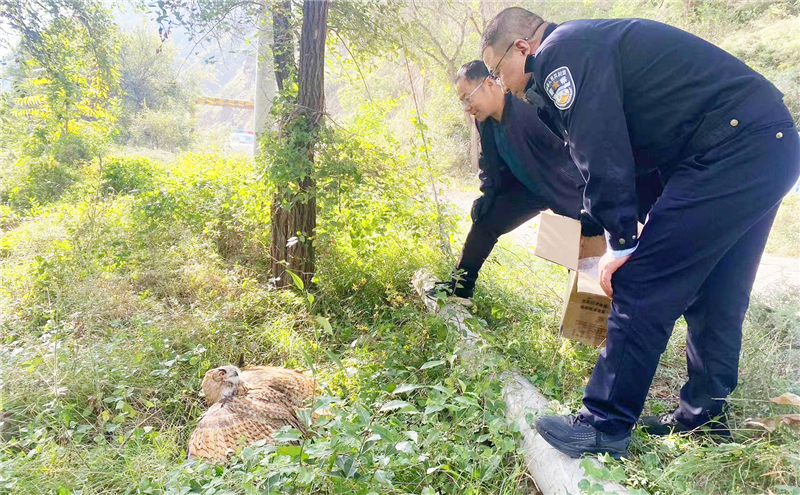 到達現場后,經確認該野生物種屬于國家二級保護動物、雕鸮(貓頭鷹)。通過現場檢查,該貓頭鷹身體狀況良好,無外傷,活動情況良好,具有野外生存能力,符合放生條件。于當日,民警將其帶至野外放歸大自然。