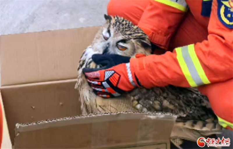 經工作人員辨認,該鳥類為雕鸮,屬國家二級保護動物,經檢查該雕鸮無外傷,符合放生條件,遂將其帶到安全區域后放回了大自然。