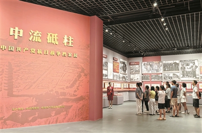 走進中國共產黨歷史展覽館四層專題展廳,首先看到一面紅底金字的大型展板,形似一本翻開的書本。“書”的正面,“中流砥柱”四個大字在燈光照射下閃閃發亮,下方緊跟一行小字“中國共產黨抗日戰爭檔案展”;側面,金色字體展示著毛澤東同志《中國共產黨在民族戰爭中的地位》里的內容:“每一個共產黨員必須發揮其全部的積極性,英勇堅決地走上民族解放戰爭的戰場,拿槍口瞄準日本侵略者。”