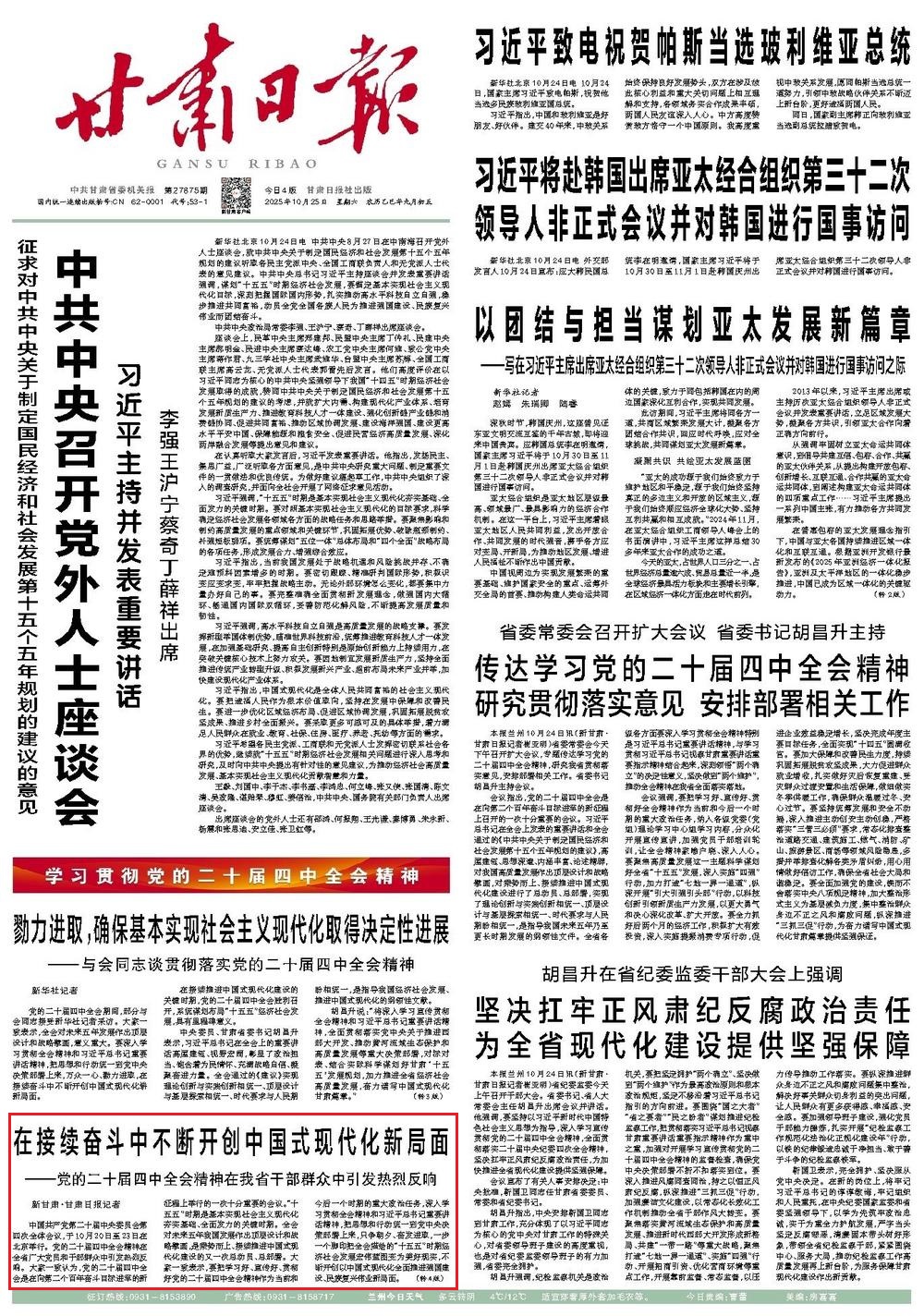 中國共產黨第二十屆中央委員會第四次全體會議,于10月20日至23日在北京舉行。黨的二十屆四中全會精神在全省廣大黨員和干部群眾中引發熱烈反響。大家一致認為,黨的二十屆四中全會是在向第二個百年奮斗目標進軍的新征程上舉行的一次十分重要的會議。“十五五”時期是基本實現社會主義現代化夯實基礎、全面發力的關鍵時期。全會對未來五年我國發展作出頂層設計和戰略擘畫,是乘勢而上、接續推進中國式現代化建設的又一次總動員、總部署。大家一致表示,要把學習好、宣傳好、貫徹好黨的二十屆四中全會精神作為當前和今后一個時期的重大政治任務,深入學習貫徹全會精神和習近平總書記重要講話精神,把思想和行動統一到黨中央決策部署上來,只爭朝夕、奮發進取,一步一個腳印把全會描繪的“十五五”時期經濟社會發展宏偉藍圖變為美好現實,不斷開創以中國式現代化全面推進強國建設、民族復興偉業新局面。