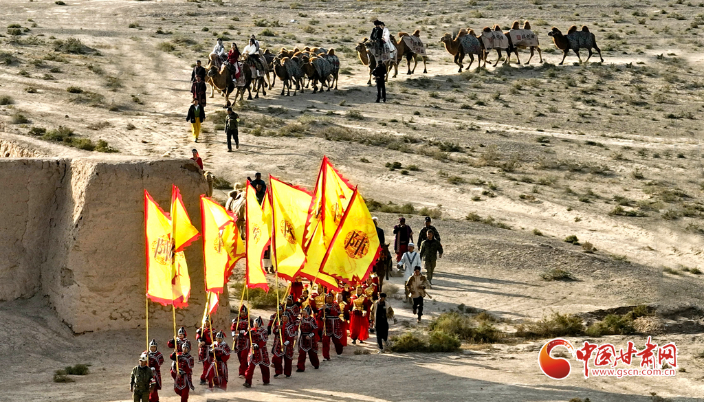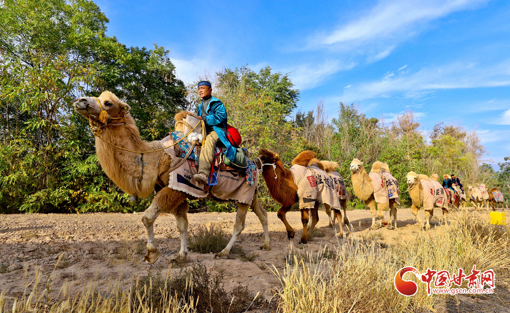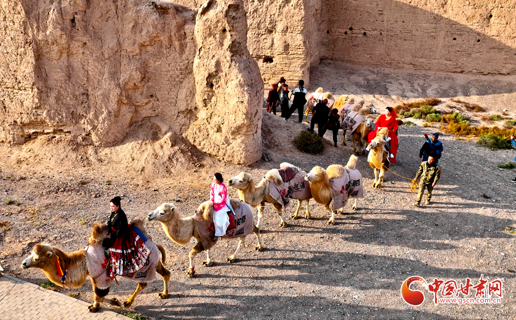 10月9日,一隊由33峰駱駝組成的駝隊行進在高臺縣境內的絲綢之路大型漢唐古文化遺址——駱駝城遺址內,千年駱駝城又響起陣陣駝鈴聲。