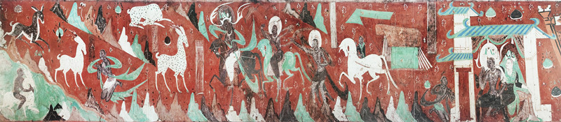 這幅壁畫在藝術風格上獨樹一幟,深受中原繪畫形式的影響。它既摒棄了印度壁畫的環形構圖方式,又不同于龜茲壁畫里的菱形畫面布局,而是開創性地采用了連環畫式的長卷式構圖,宛如一條歷史的長河,將故事娓娓道來。
