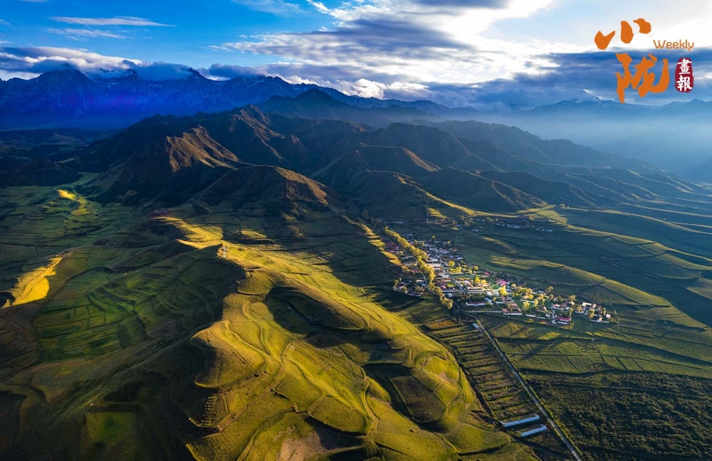 秋風溫柔,山川壯美。祁連山腳下,泛黃的草原如同大地鋪開的地毯,伸向天際。遠處的山川,近處的村莊、樹木沉浸在金色的光芒中,一幅五彩斑斕的秋景圖。