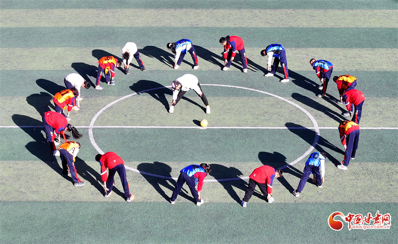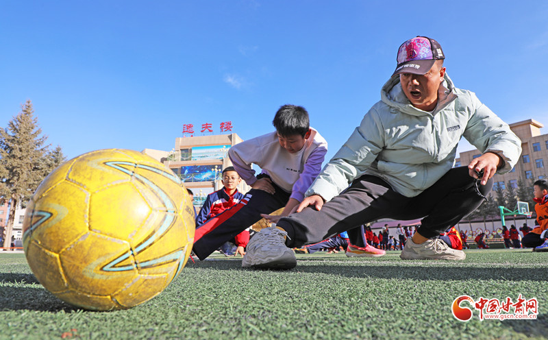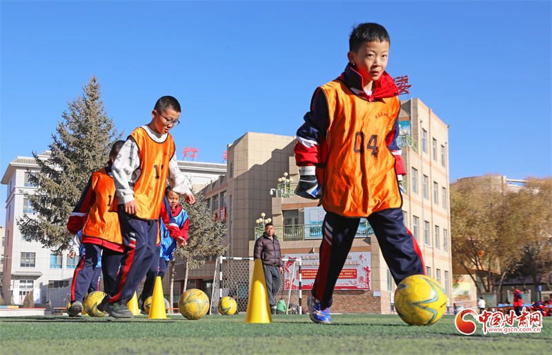 11月11日,在張掖市民樂(lè)縣洪水小學(xué)的足球場(chǎng)上,學(xué)生們?cè)谶M(jìn)行足球訓(xùn)練。