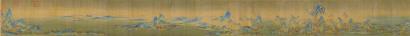 公元1100年19歲趙佶登基,年輕的宋徽宗開啟了屬于他的藝術新紀元。在徽宗傾力關心的翰林圖畫院中聚集了一大批優秀的畫家,如李唐、朱銳、張擇端,其中李唐的《江山小景》,張擇端的《清明上河圖》都以手卷的形式描繪了從自然到都市的繁華,這樣的極致華麗是宋代院體山水畫卷的主旋律。最能體現華麗之美的山水卷莫過于出自當時還未入畫院,但已被徽宗視為“其性可教”并“親授其法”的18歲少年王希孟所繪的《千里江山圖》。此卷縱51.5厘米,橫1191.5厘米,可謂真正的長卷,所繪千山萬壑,峰巒起伏連綿,江河煙波浩渺壯麗,山林間有人物、飛泉、房舍、樓臺、林木、花竹、漁舟、游船,遠處島嶼相疊,汀渚綿延,水天相接,好一個理想中華麗光明的太平世界。山水是宇宙之大物,人在山林丘壑間游歷是見不到山水之全貌的。山水畫要將千里之景容納咫尺絹素,唯手卷的形制才得以在有限之內展示無限的浩瀚。