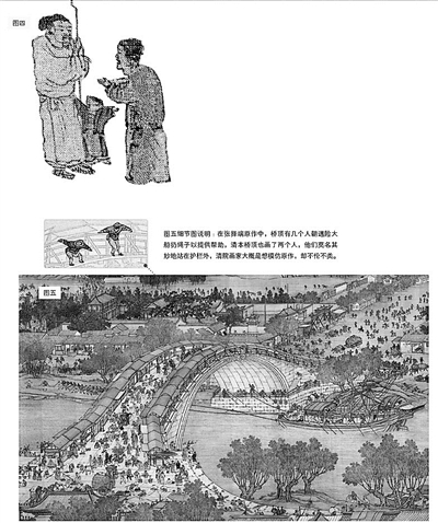 《清明上河圖》在后世有兩種重要的仿本,一個是明代仇英款仿本,一個是清院本。在本文結束之前,我要以清院本中的虹橋為例,來說明仿本與張擇端原作的一個重要差別。請看圖五,那就是清院本中的虹橋,那橋梁雄偉壯大,氣勢如虹,是吧?再看船與橋的關系,船很大,但桅桿早就放下來,完全可以順利通過。再看那些人物,他們小小的,就像螞蟻。他們像螞蟻,不是因為我們把圖縮得小,實際上,即使放大,也無法看出他們的個性、情緒,換句話說,這些人與其說是人,不如說是一些符號。把人符號化與賦予人物個性,這是仿本與原作的極大區別,也是我極力推崇原作的原因所在。《清明上河圖》,我們就看到這里。(文并供圖/田玉彬)