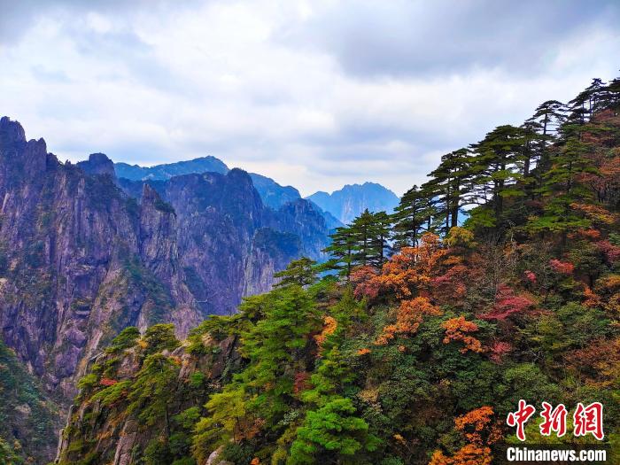 資料圖:黃山風景區樹木色彩分層,紅黃相間。陳偉 攝