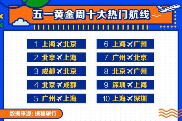 《報(bào)告》稱,今年五一期間,消費(fèi)者跨省出游意愿強(qiáng)烈,攜程機(jī)票單日訂單量對比2019年同期最高增幅約28%。上海-北京、北京-上海、成都-北京、北京-成都、廣州-上海、上海-廣州、廣州-北京、北京-廣州、深圳-上海、上海-深圳為“五一”黃金周十大熱門航線。