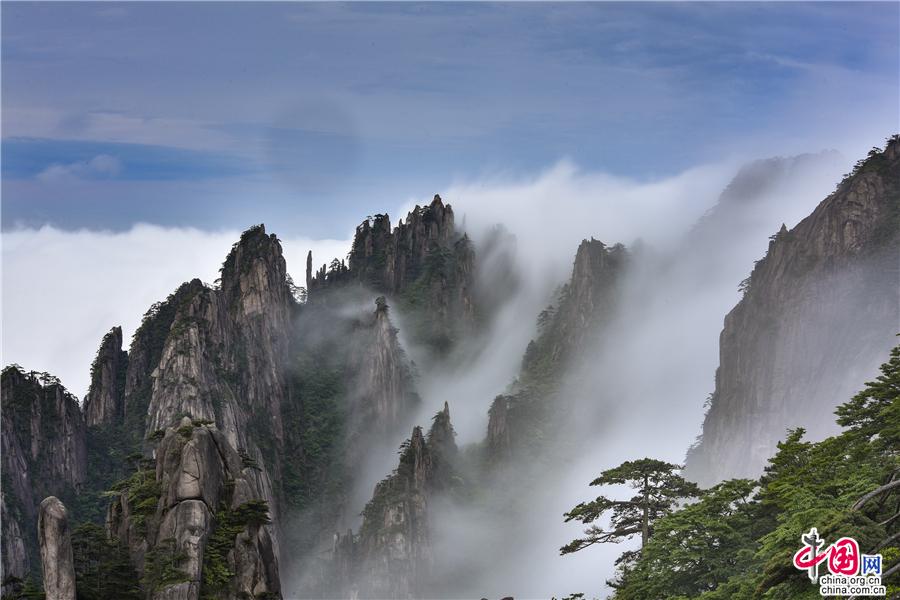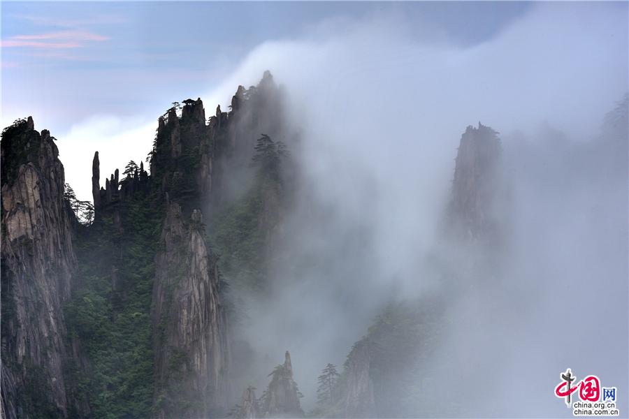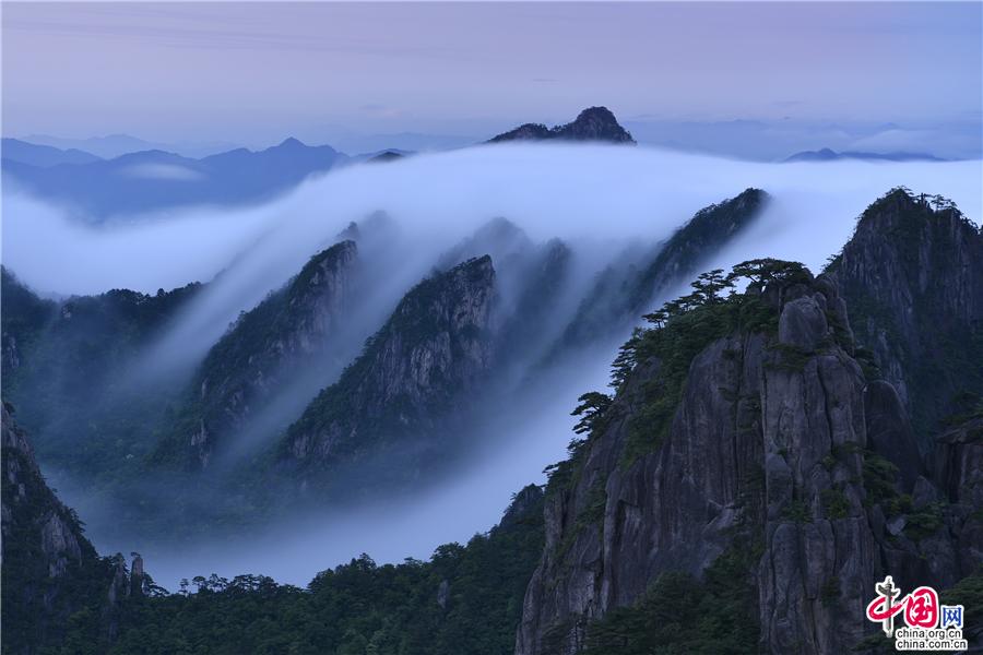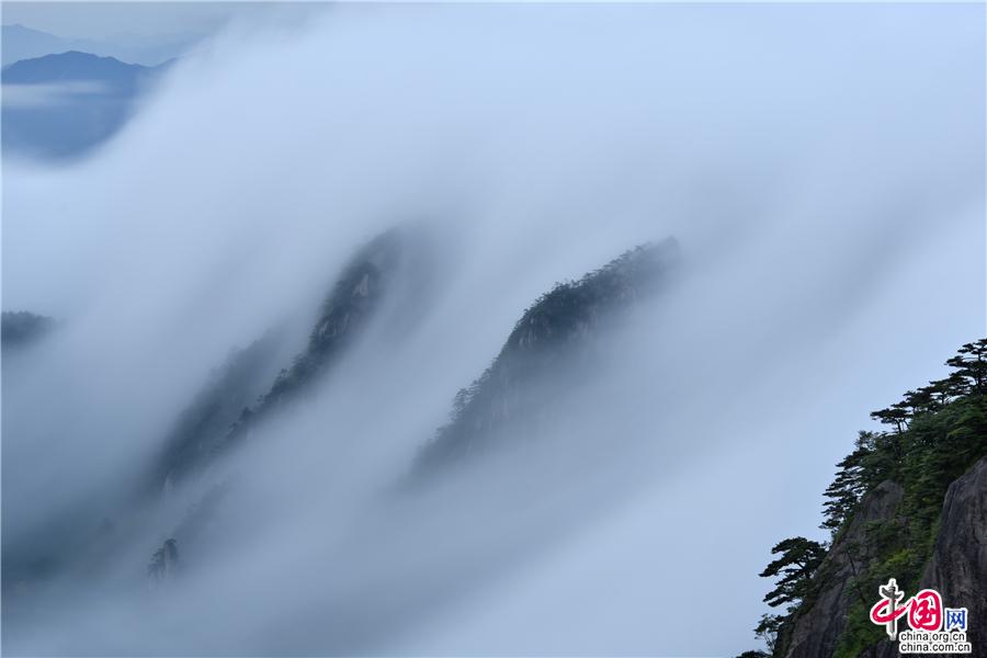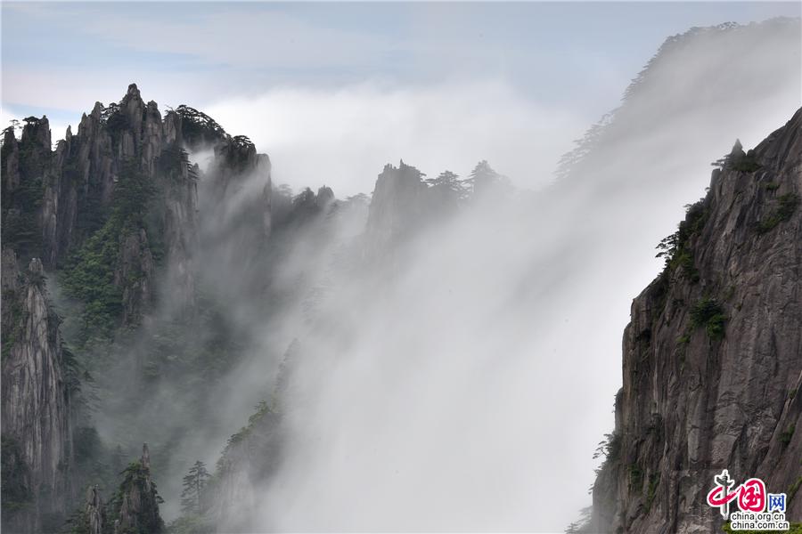 5月22日傍晚,雨后安徽黃山風景區現壯觀的云海奇觀,見云海奔騰而來,越過北海的始信峰,沿著群峰傾瀉而下勢如瀑布之壯觀,在奇群、怪石和形態各異黃山松的作用下勾勒出一幅幅流動的水墨畫;黃山不僅是云霧之鄉,更是中國傳統水墨畫的天然的素材。(姚育青)