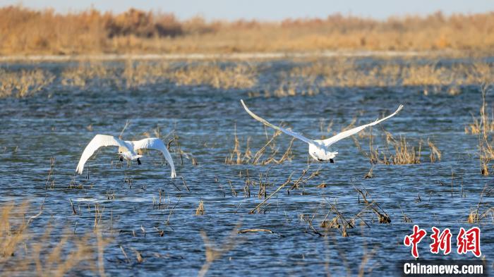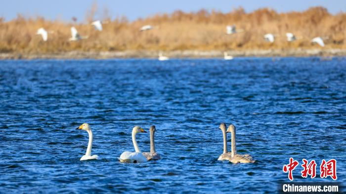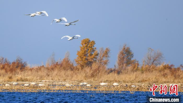 中新網烏魯木齊11月15日電(年磊)11月14日,位于新疆維吾爾自治區巴音郭楞蒙古自治州博湖縣境內的博斯騰湖白鷺洲迎來大批天鵝,它們三五成群結伴游弋,嬉戲追逐,優雅的身姿成為博斯騰湖一道靈動的風景線。