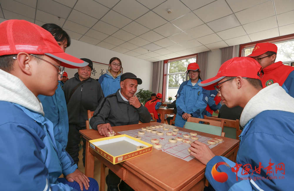 學生志愿者與老人一起下象棋