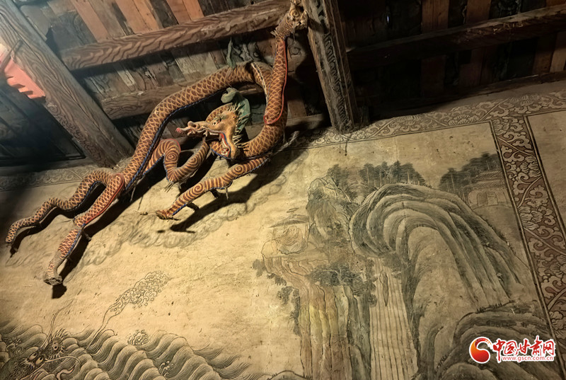 順著羅漢目視的方向望去,龍盤踞于房梁之上,若參照龍背后的壁畫,又仿佛這條龍正翱翔于天空之上。這一獨特設計,源于張掖大佛寺深厚的歷史背景。
