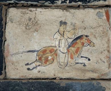 它的“不一般”,首先在于其“極簡(jiǎn)卻傳神”的藝術(shù)風(fēng)格。該磚的畫(huà)面以赭石色為底,墨線(xiàn)寥寥,卻生動(dòng)勾勒出一位策馬疾馳的驛使:頭戴魏晉幘帽,身著右衽短衫,左手控韁,右手舉著文書(shū)。而駿馬則四蹄騰空,動(dòng)態(tài)感十足,一種風(fēng)馳電掣的緊迫感似從畫(huà)中撲面而來(lái)。更耐人尋味的是,畫(huà)師刻意省略了驛使的嘴巴:這一“殘缺”設(shè)計(jì),并非疏忽,而是古人智慧的體現(xiàn),象征著郵驛制度中“守口如瓶”的保密原則,使其成為中國(guó)古代信息保密文化的生動(dòng)見(jiàn)證。