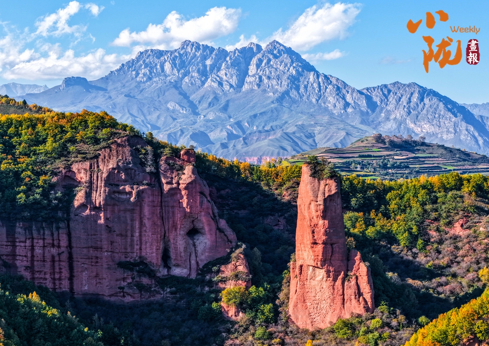 俯瞰整個冶力關,遠處的雪峰在陽光照耀下泛著銀光,與近處的彩林形成鮮明對比,宛如一幅氣勢磅礴的山水畫卷。